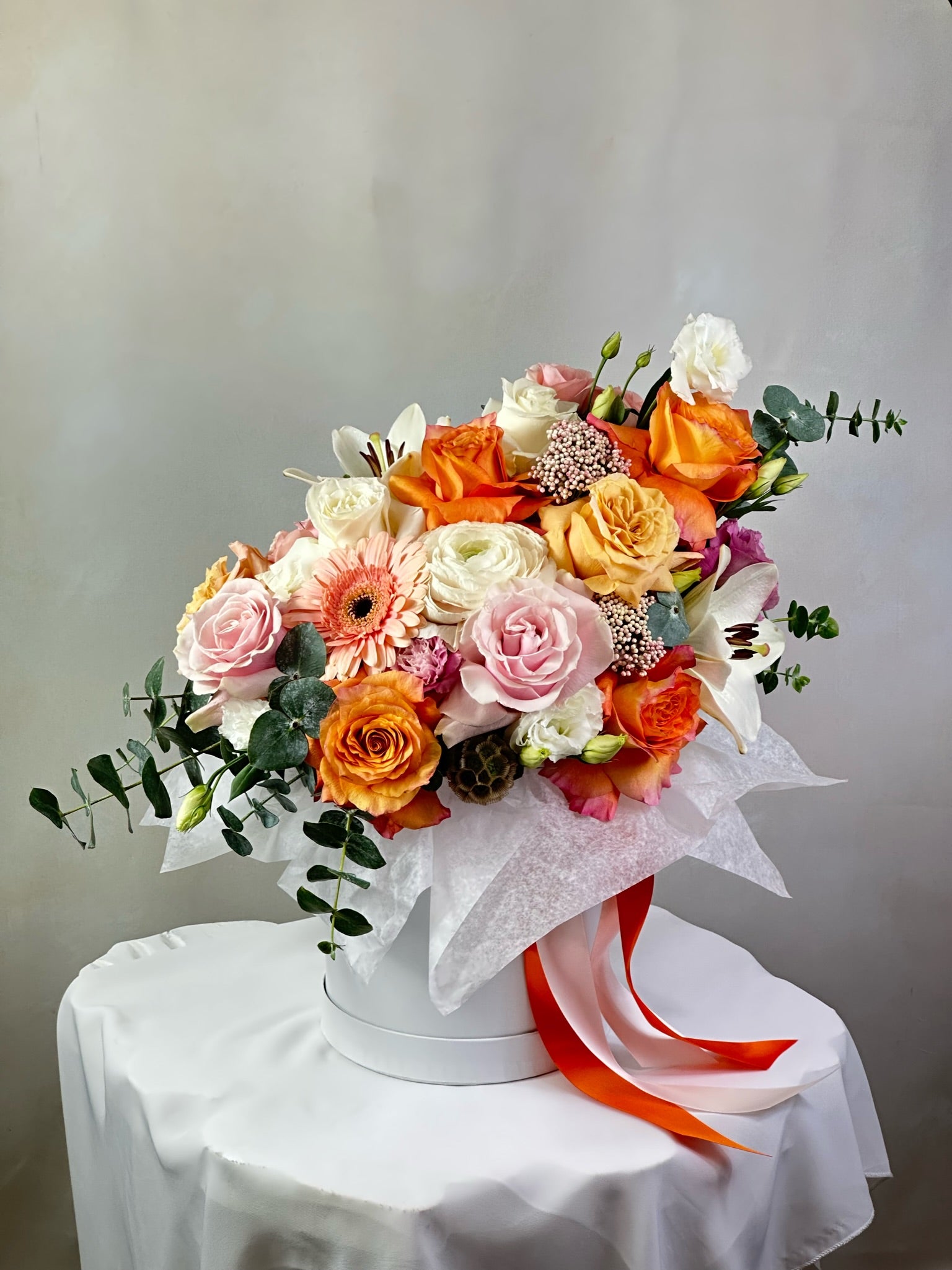 Introducing a captivating floral arrangement that weaves together the vibrant charm of gerbera and lily with the delicate beauty of lisianthus and spray roses. Accentuated by the whimsical scabiosa pods, fragrant eucalyptus, and the soft allure of ranunculus, this composition is perfectly framed by the verdant embrace of pittosporum and premium roses. 'Amber Sky' created by our expert florist in Scottsdale captures the essence of timeless grace and blooms with everlasting love. It's the perfect gift to convey your most heartfelt emotions or to adorn your space with enduring beauty.