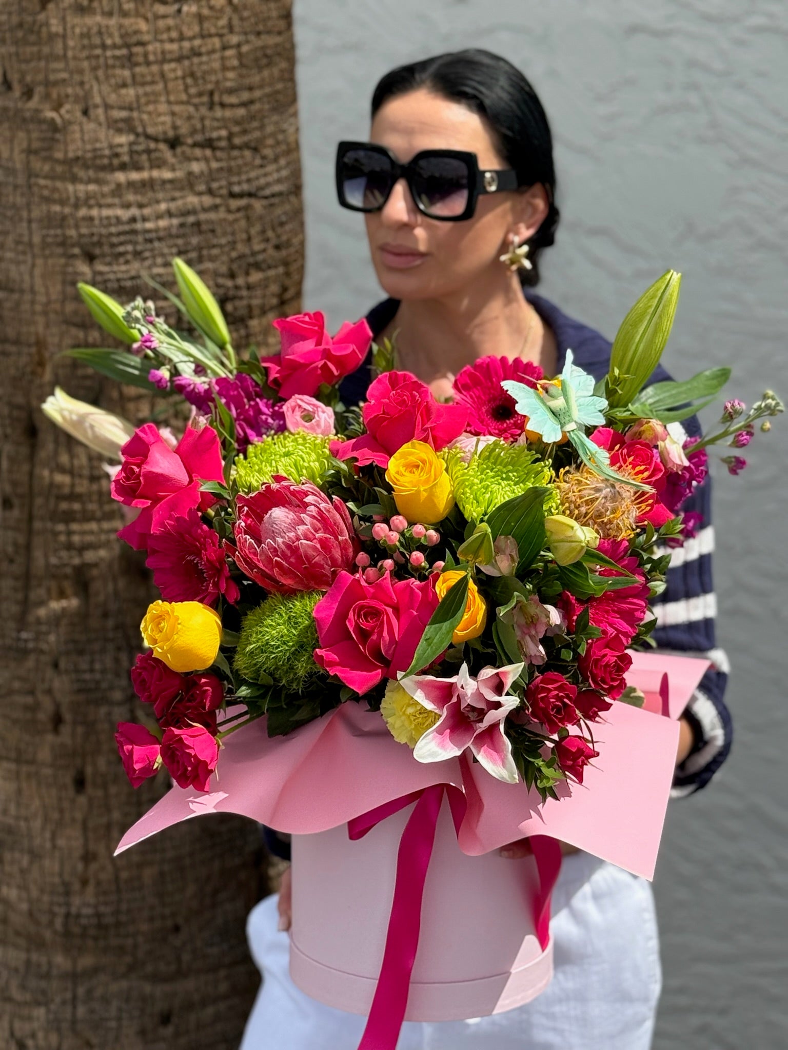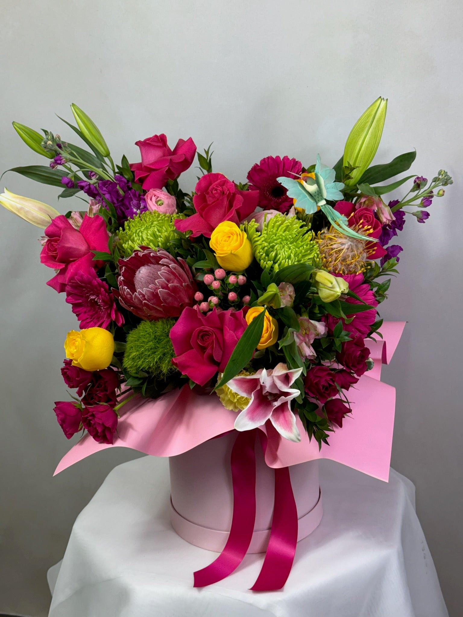 Vibrant, exotic, and irresistibly chic, Aruba features lush tropical blooms in bold shades of coral, fuchsia, orange, and lime green. Styled to impress, this arrangement brings the joyful, carefree spirit of island life right into your home or celebration.