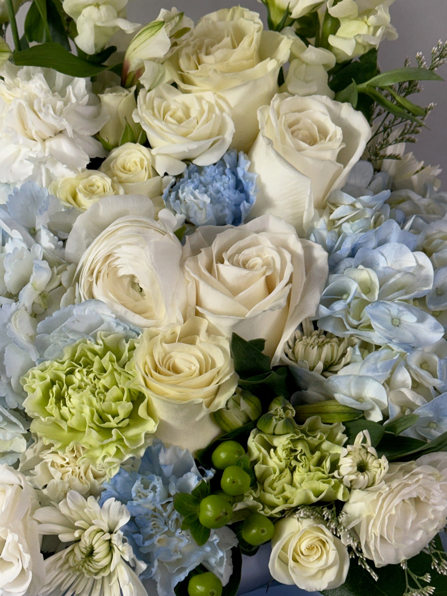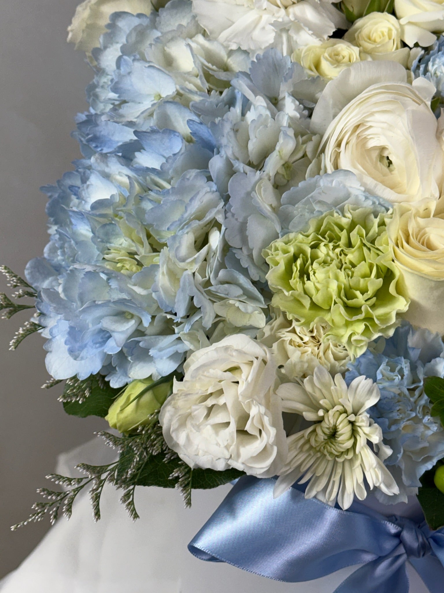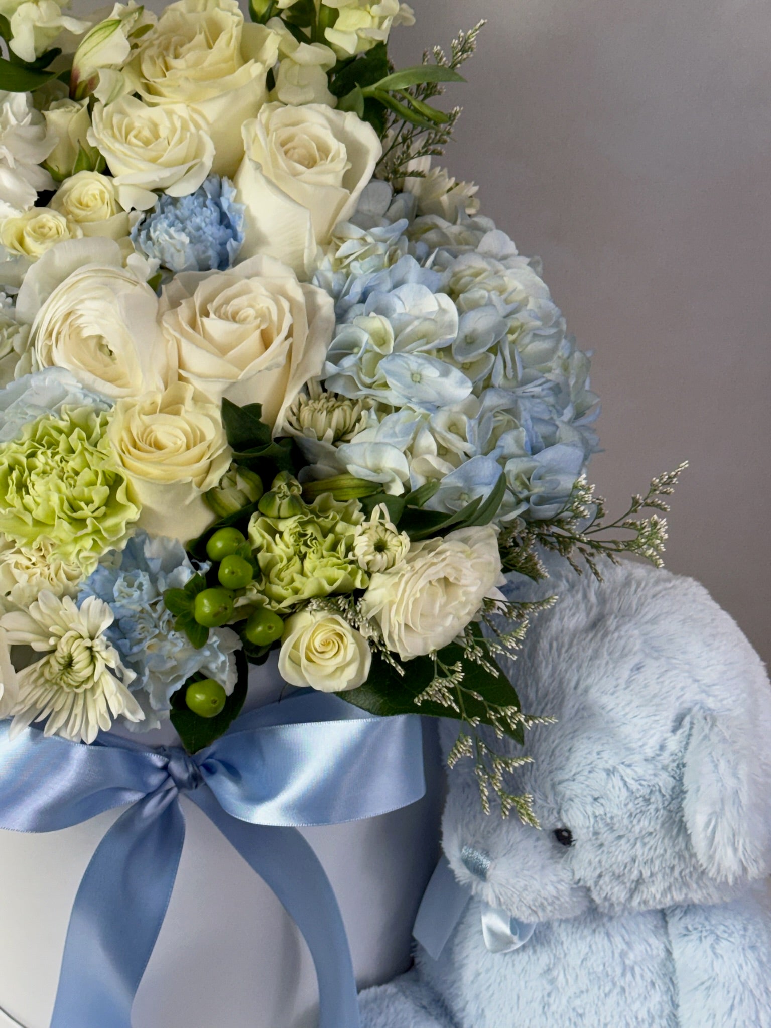 Welcome Baby Boy is a heartwarming floral design crafted to celebrate life’s sweetest arrival. Featuring a serene mix of powder blue hydrangeas, creamy white roses, lisianthus, and delicate green accents, this arrangement is elegantly presented in a white hatbox wrapped with a satin blue ribbon.