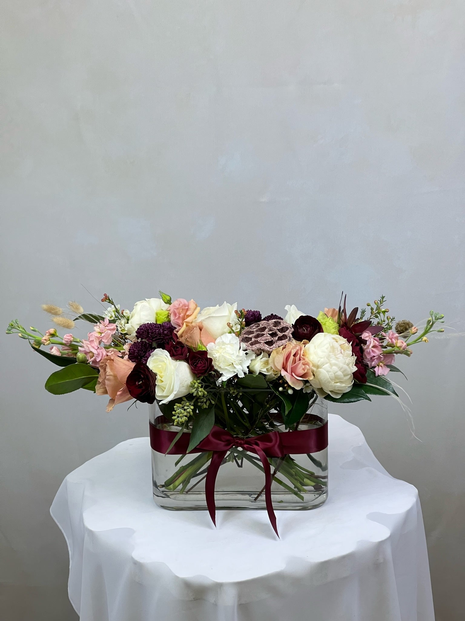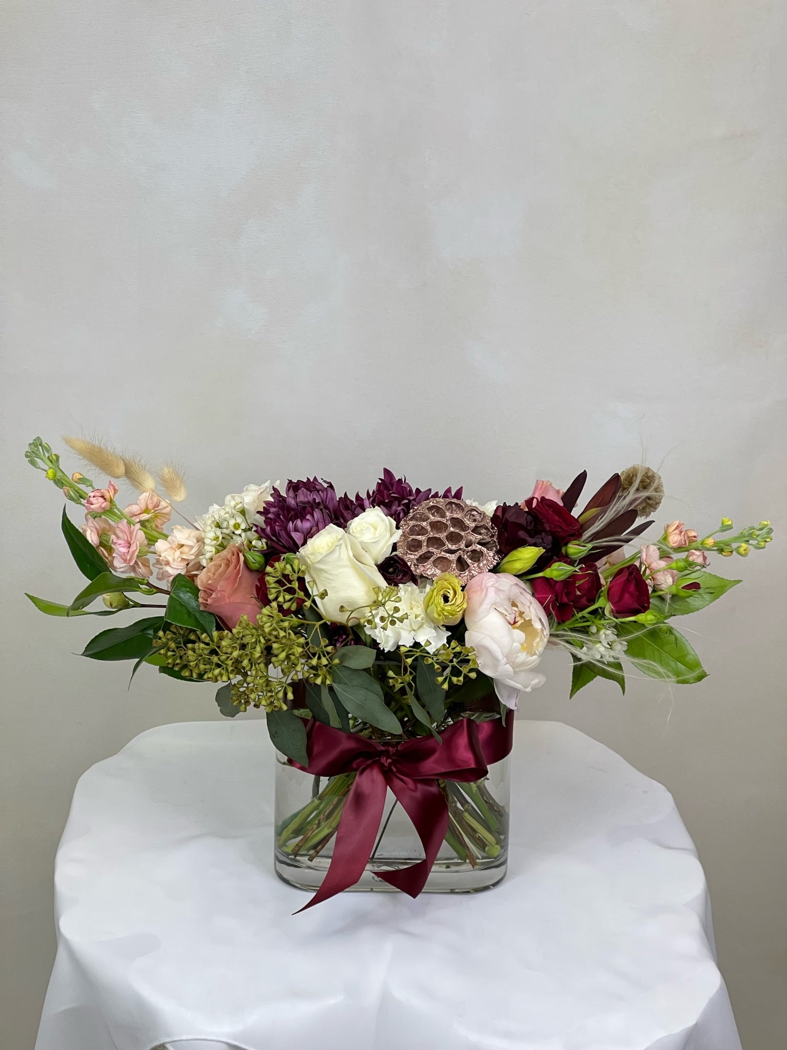 Add a touch of luxury to any room with our boho-inspired floral composition. This one-of-a-kind arrangement features a carefully curated selection of blooms including peonies, roses, stocks, eucalyptus seeded, carnations, lisianthus, daisies, ranunculus, wax, dry lotos, bunny tails, safari sunset, and more, accented with camellia and eryngium for a truly unique look.