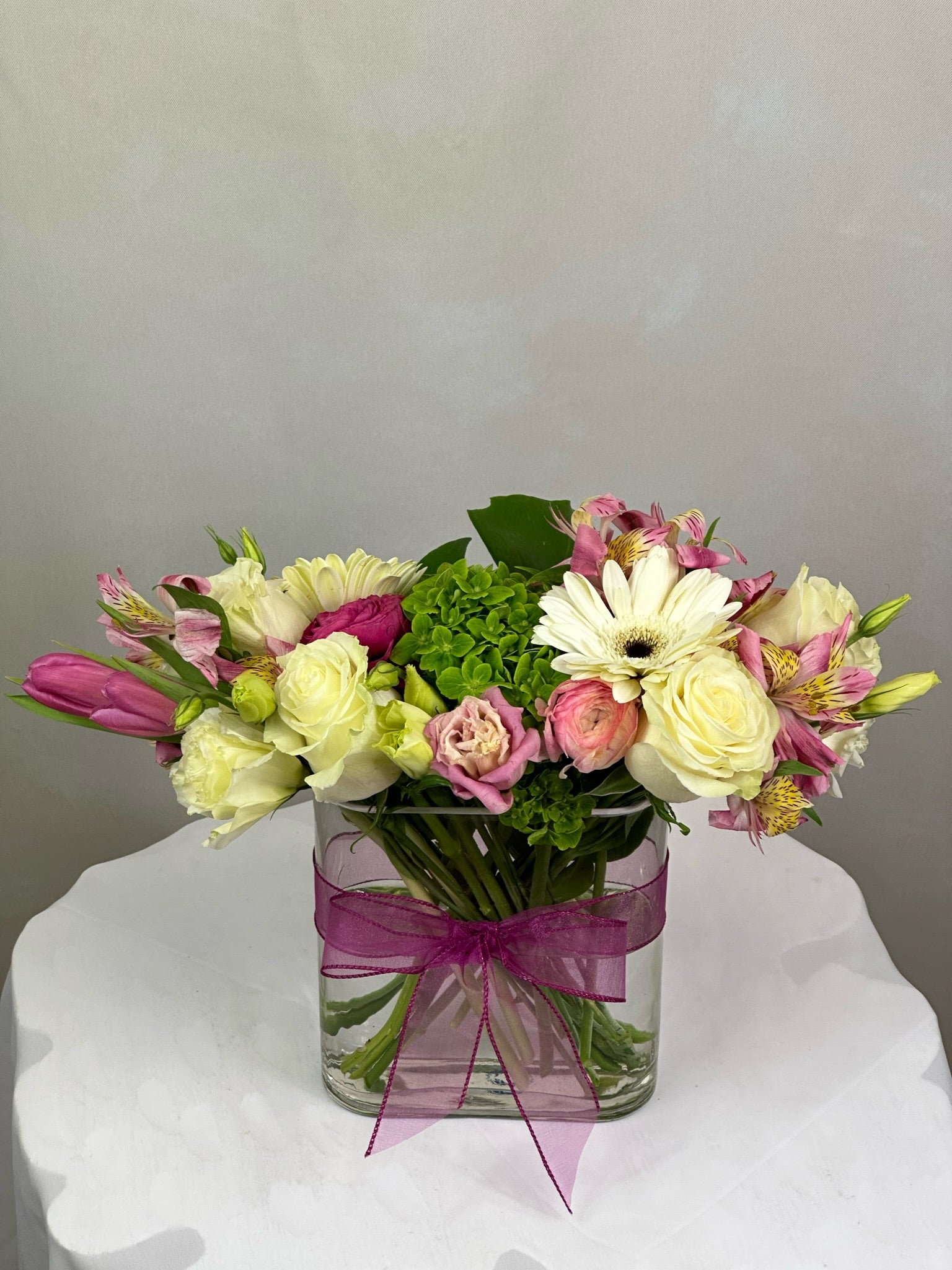 Delicate yet striking, Chloe is a luxurious floral arrangement that radiates charm and sophistication. Designed in an elegant vase, this breathtaking composition features Wasabi roses, tulips, carnations, hydrangeas, lisianthus, gerbera daisies, and ranunculus, expertly arranged to create a harmonious blend of texture and color.