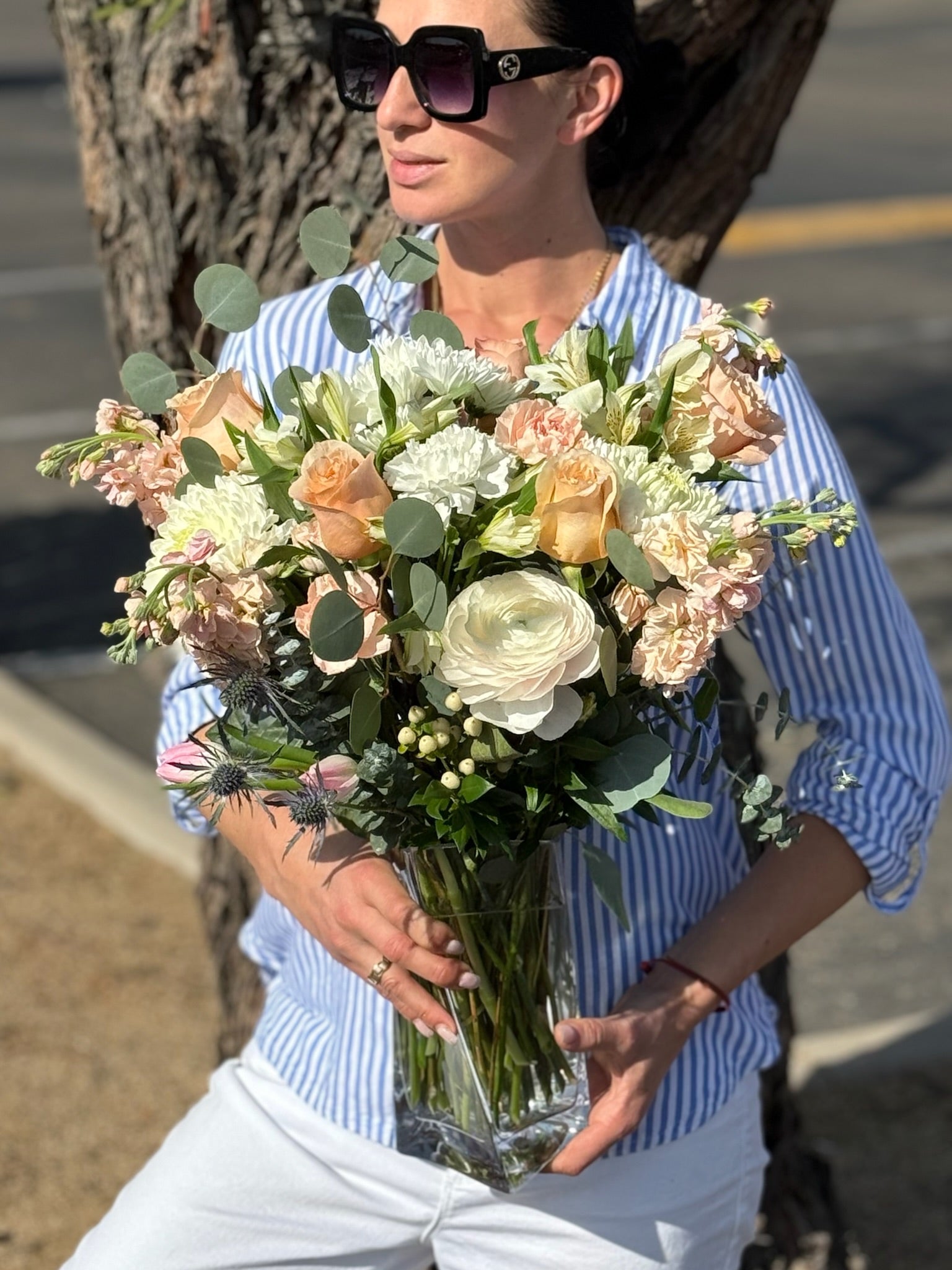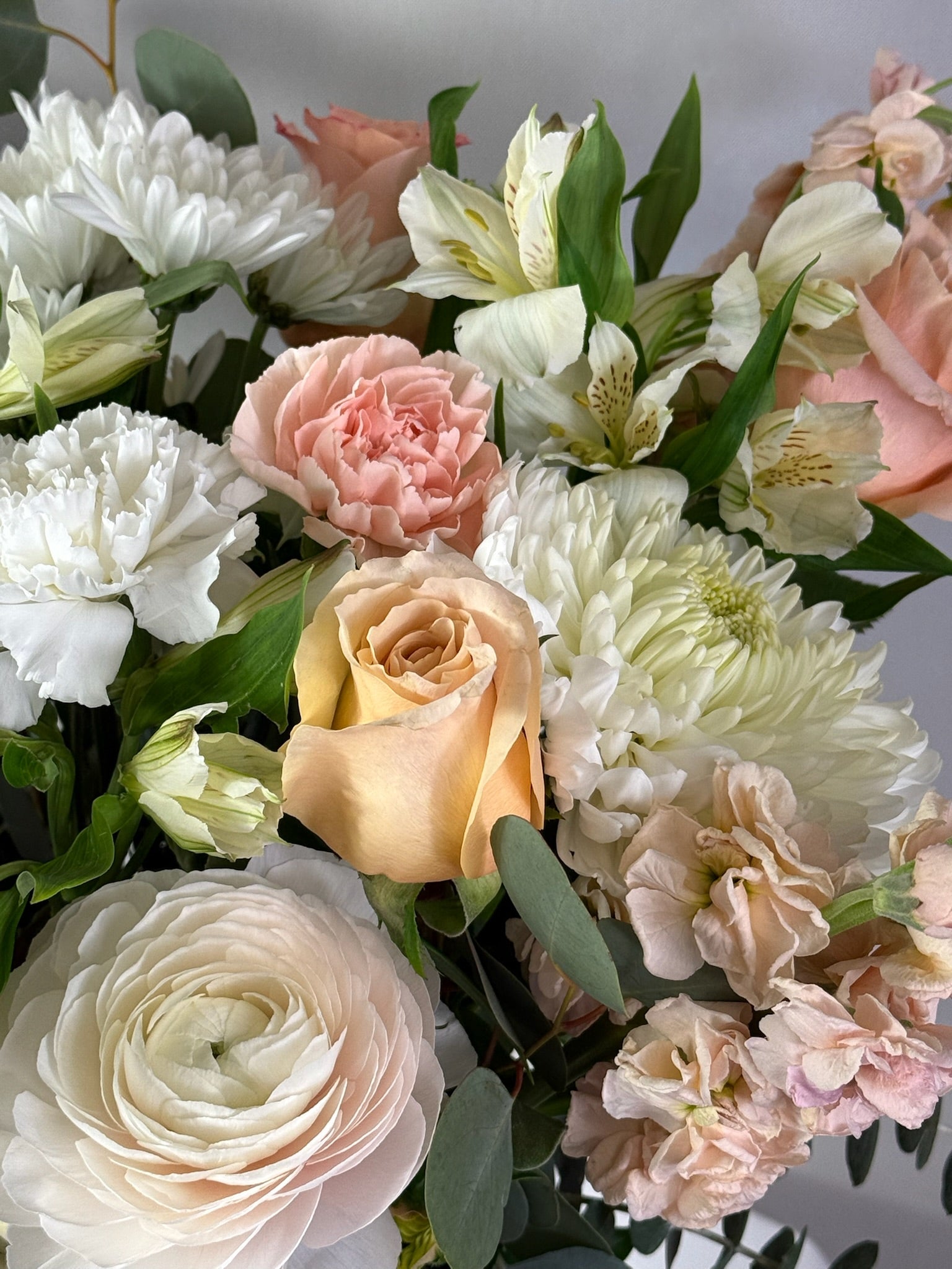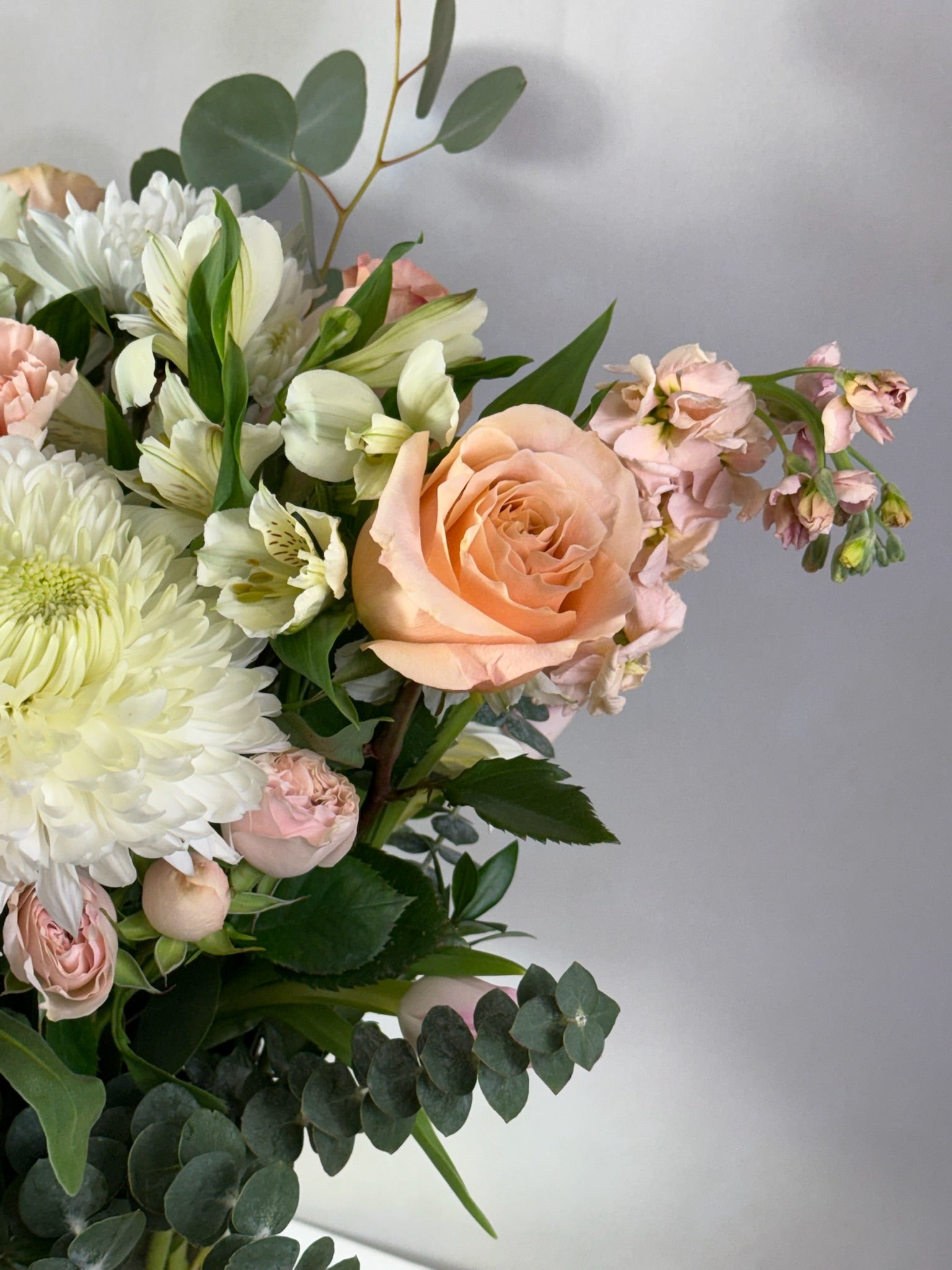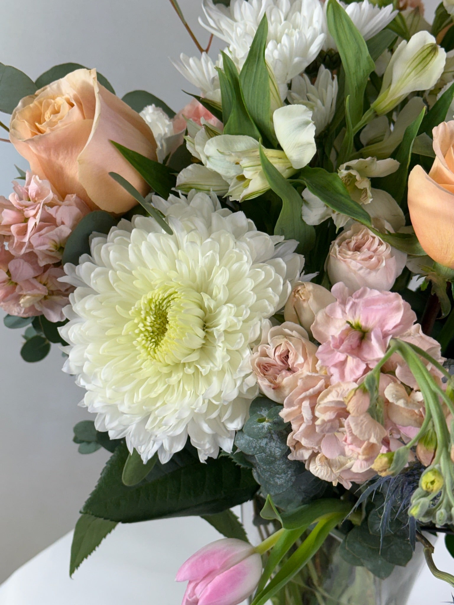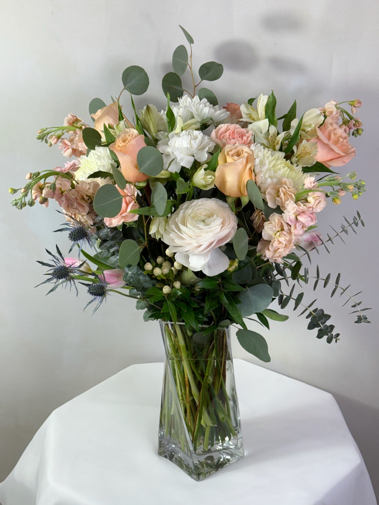 Inspired by the serene beauty of the Mediterranean, Cyprus is a lush arrangement of soft peach roses, ivory ranunculus, blush stock, white mums, and textural greenery including eucalyptus and thistle. Styled in a tall glass vase, it’s a sophisticated blend of elegance and natural charm — perfect for any occasion.