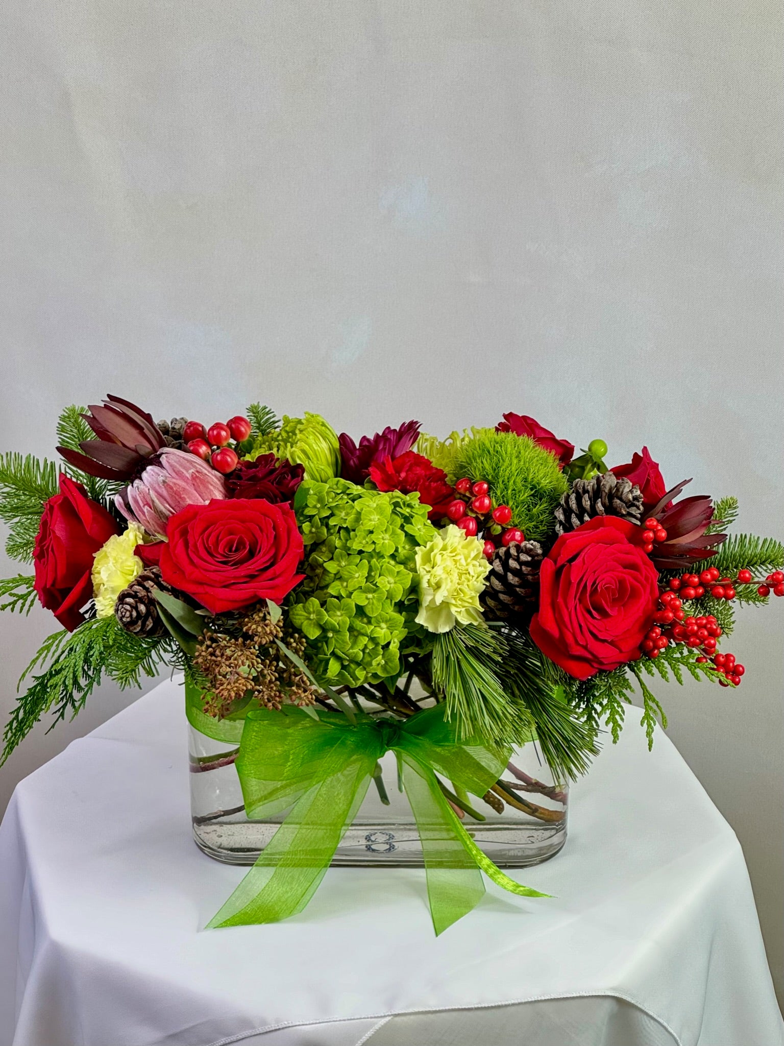 Celebrate the holidays with "Emerald Serenity," a stunning Christmas floral arrangement available for online order at our Scottsdale florist. Enjoy the ease of flower delivery in Scottsdale as you send festive joy and beauty to your loved ones. With Safari blooms, Hydrangea, Mums spider, and more, this arrangement captures the enchantment of the season. Order online and bring the magic of Christmas to your doorstep or surprise someone special with this exquisite floral gift. Elevate your holiday celebrations with the artistry of our Scottsdale florists.