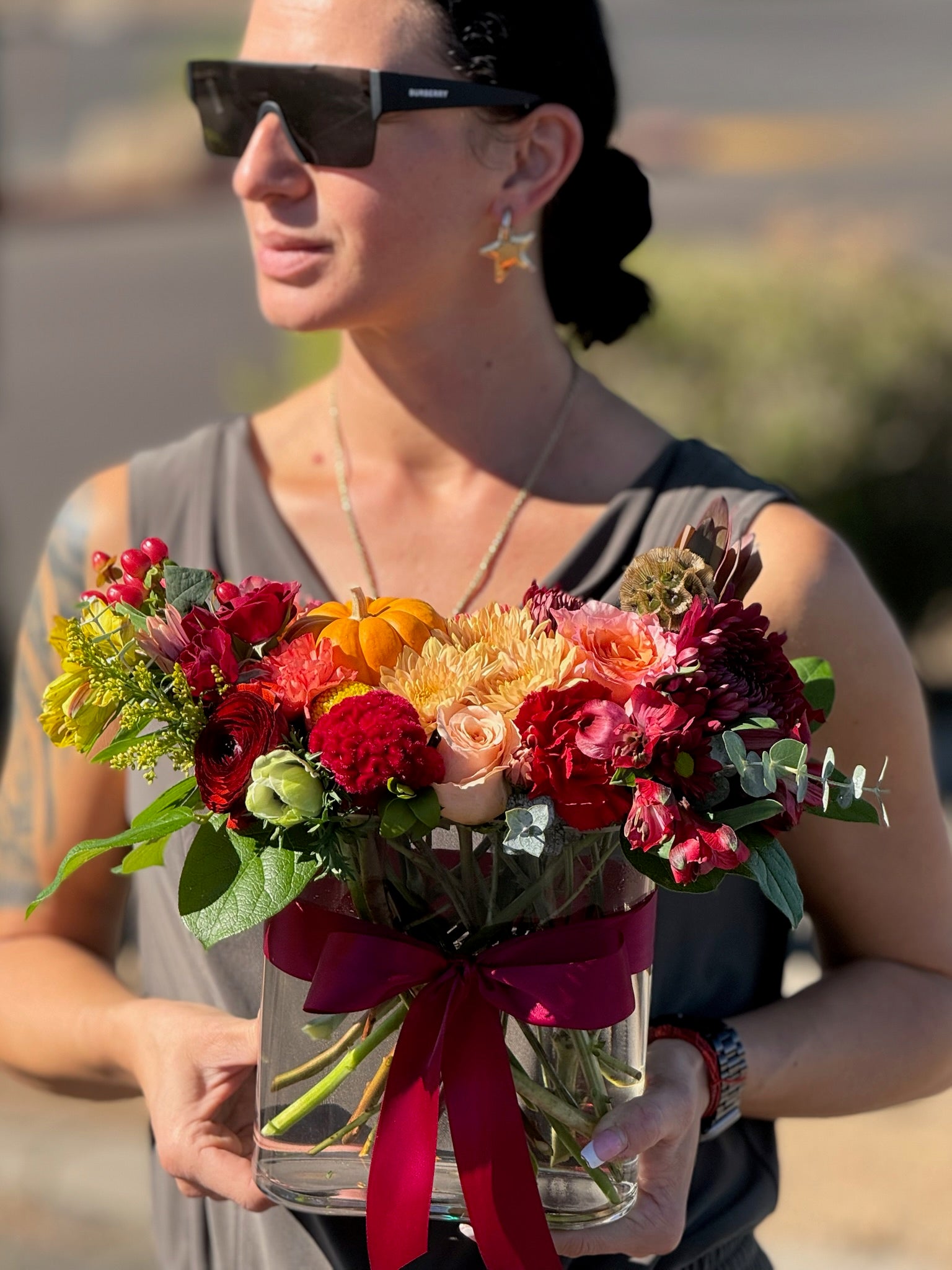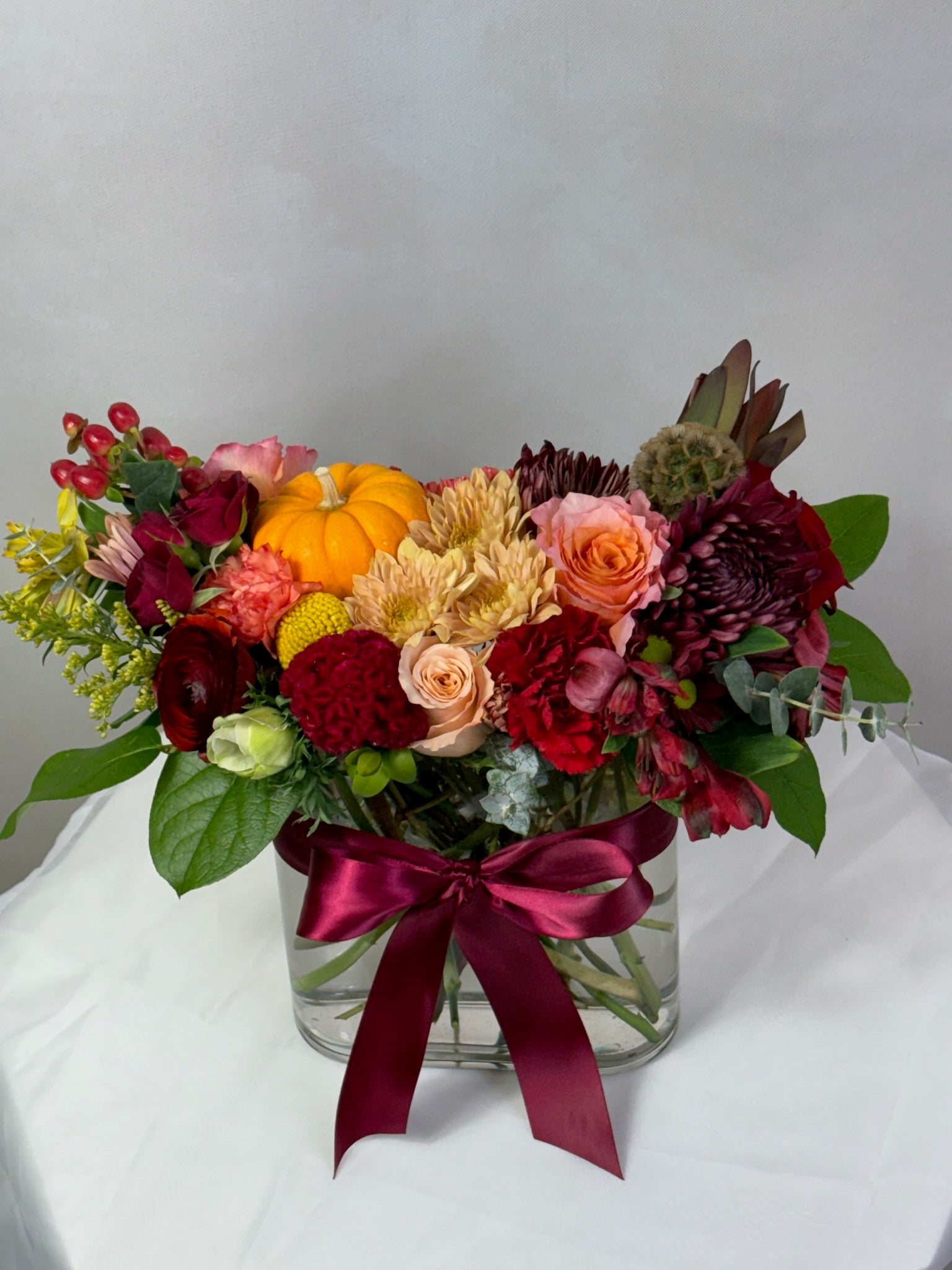 This autumnal arrangement in a vase radiates warmth and elegance, blending soft, creamy hues with rich, earthy tones. The arrangement captures the essence of fall with a harmonious mix of textures—delicate, flowing blooms meet sturdy, rustic stems, evoking a cozy, seasonal charm. Deep shades of amber, gold, and burgundy add layers of warmth, while hints of blush provide a soft contrast that adds sophistication. Displayed in an understated vase, this piece feels both refined and welcoming, perfect for enhancing any space with the natural beauty and richness of fall.