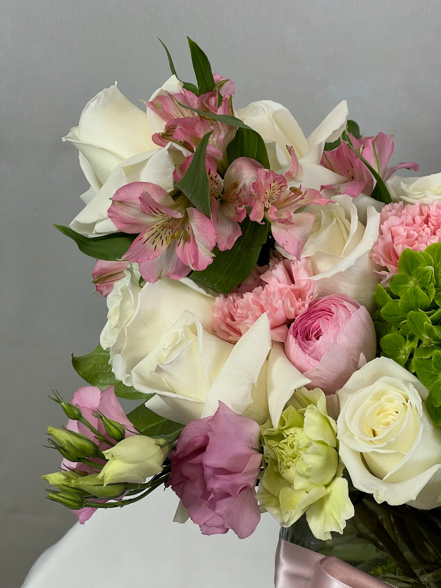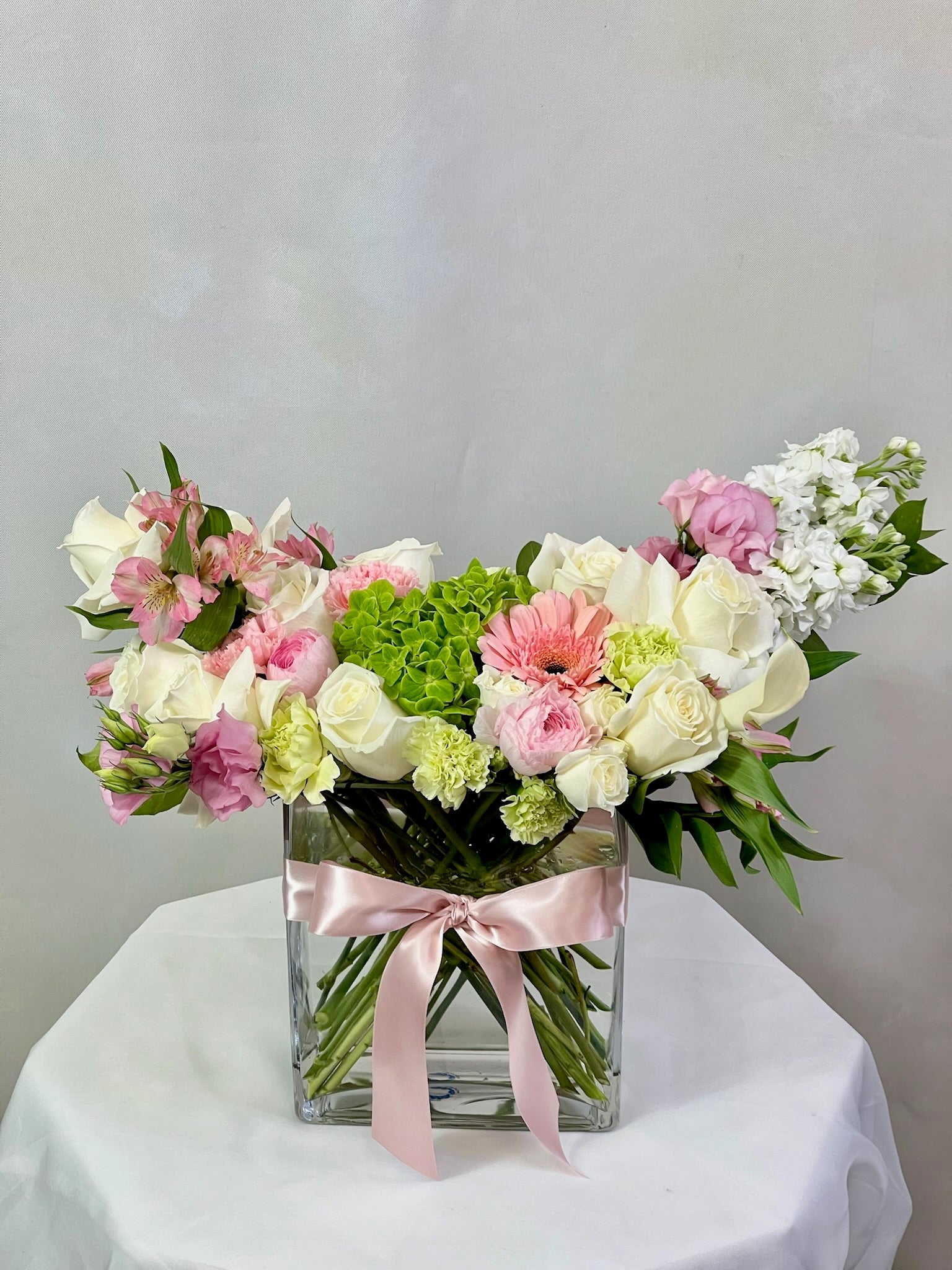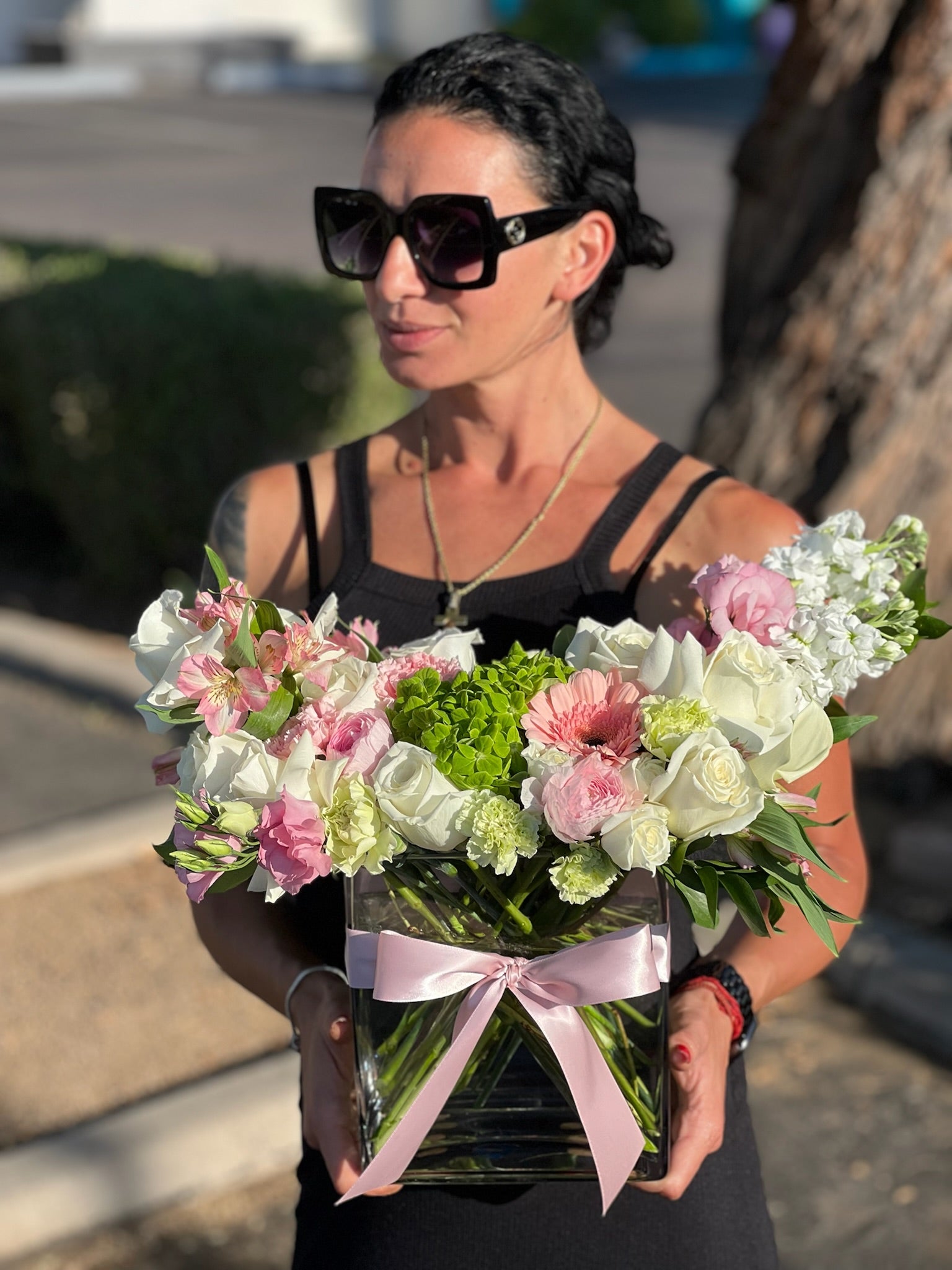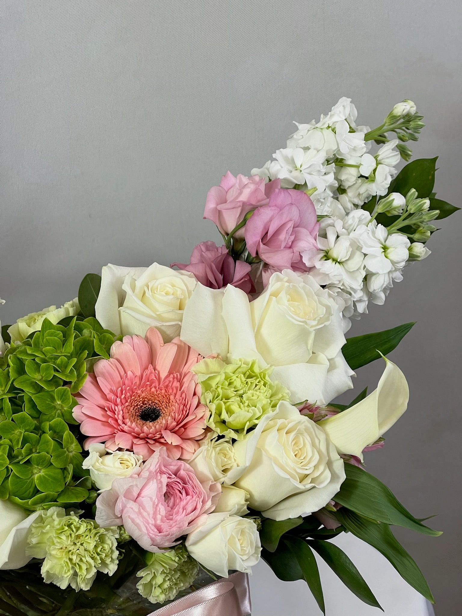 Introducing Graciosa, a refined and elegant flower arrangement that exudes timeless beauty. Featuring a stunning blend of delicate roses, elegant ranunculuses, and soft seasonal accents, this arrangement is designed to bring a touch of sophistication to any occasion. Displayed in a modern vase, Graciosa offers a graceful balance of color and texture, making it perfect for enhancing your home or gifting to someone special.