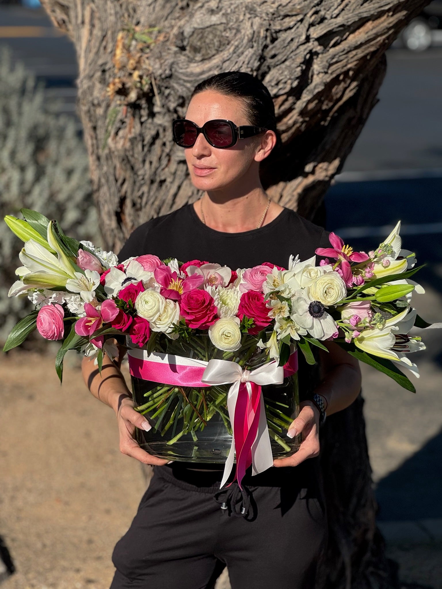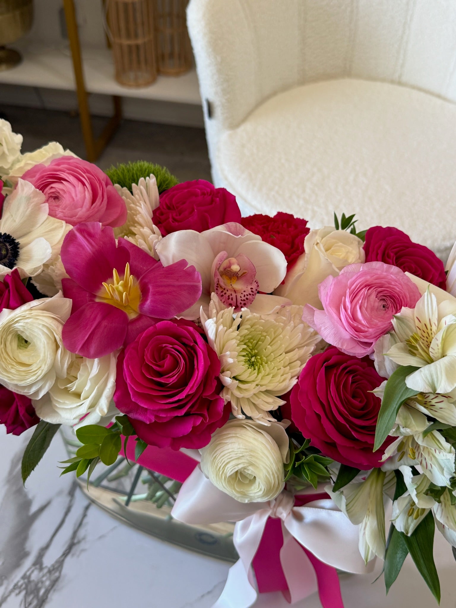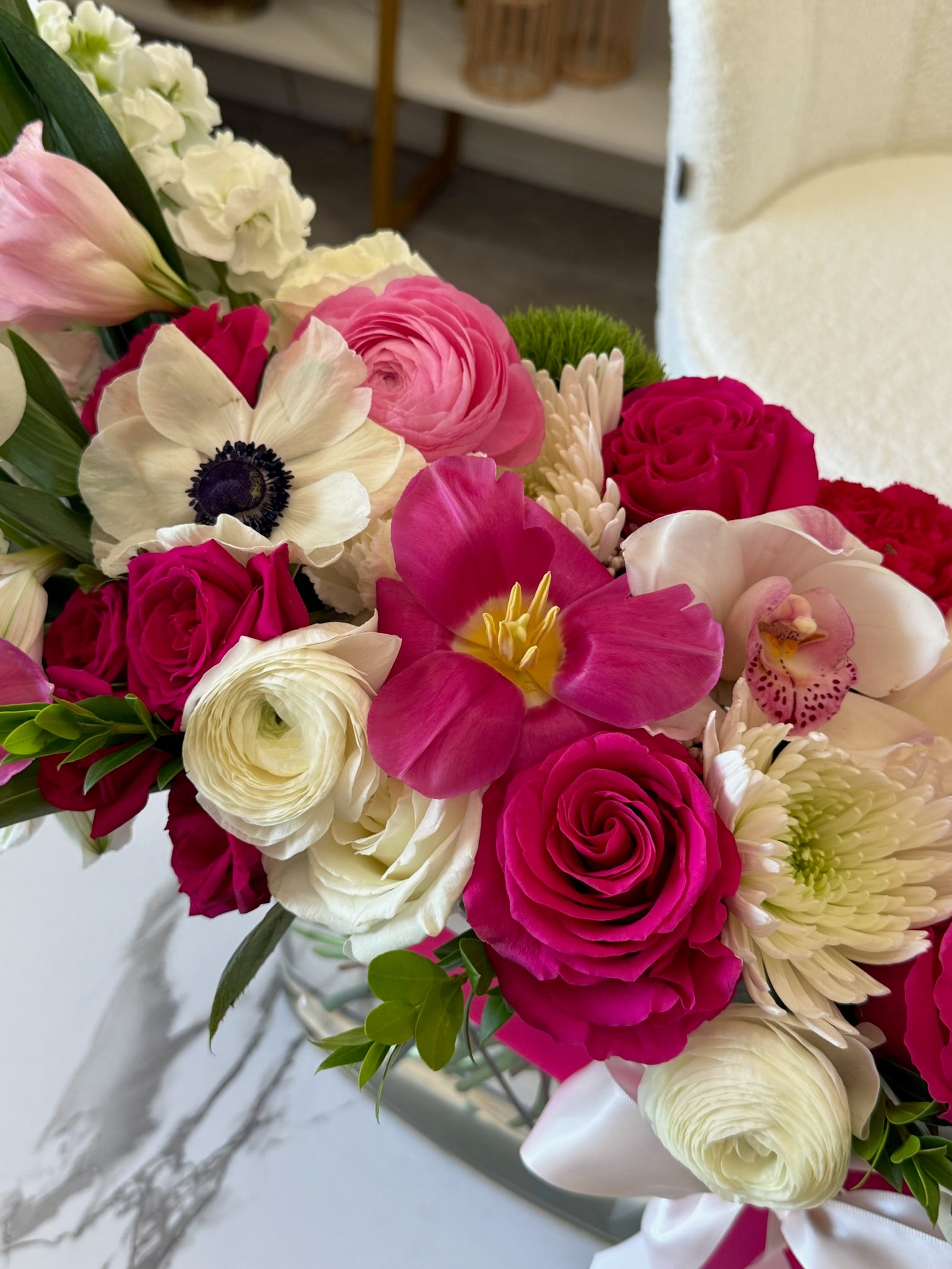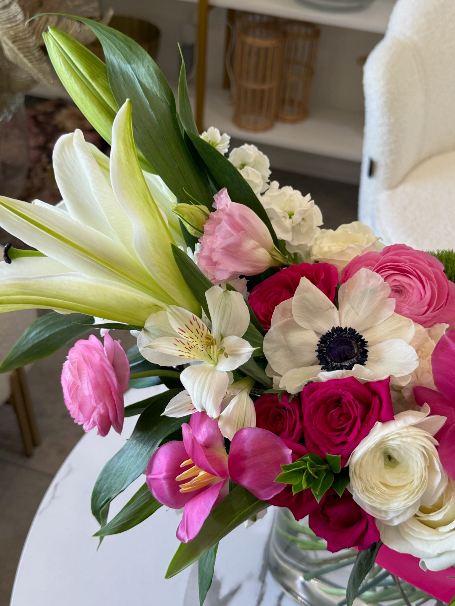 Magnifique — A breathtaking display of elegance and charm, featuring vibrant pinks, crisp whites, and graceful lilies in full bloom. Presented in a unique large curved vase, this luxurious arrangement radiates sophistication and artistic beauty, making it a true centerpiece for any space.