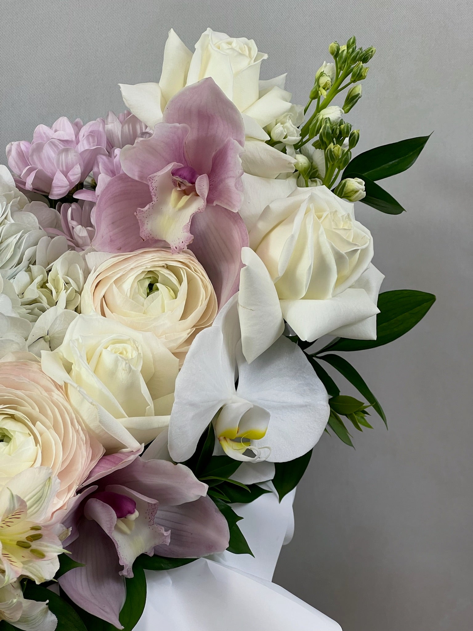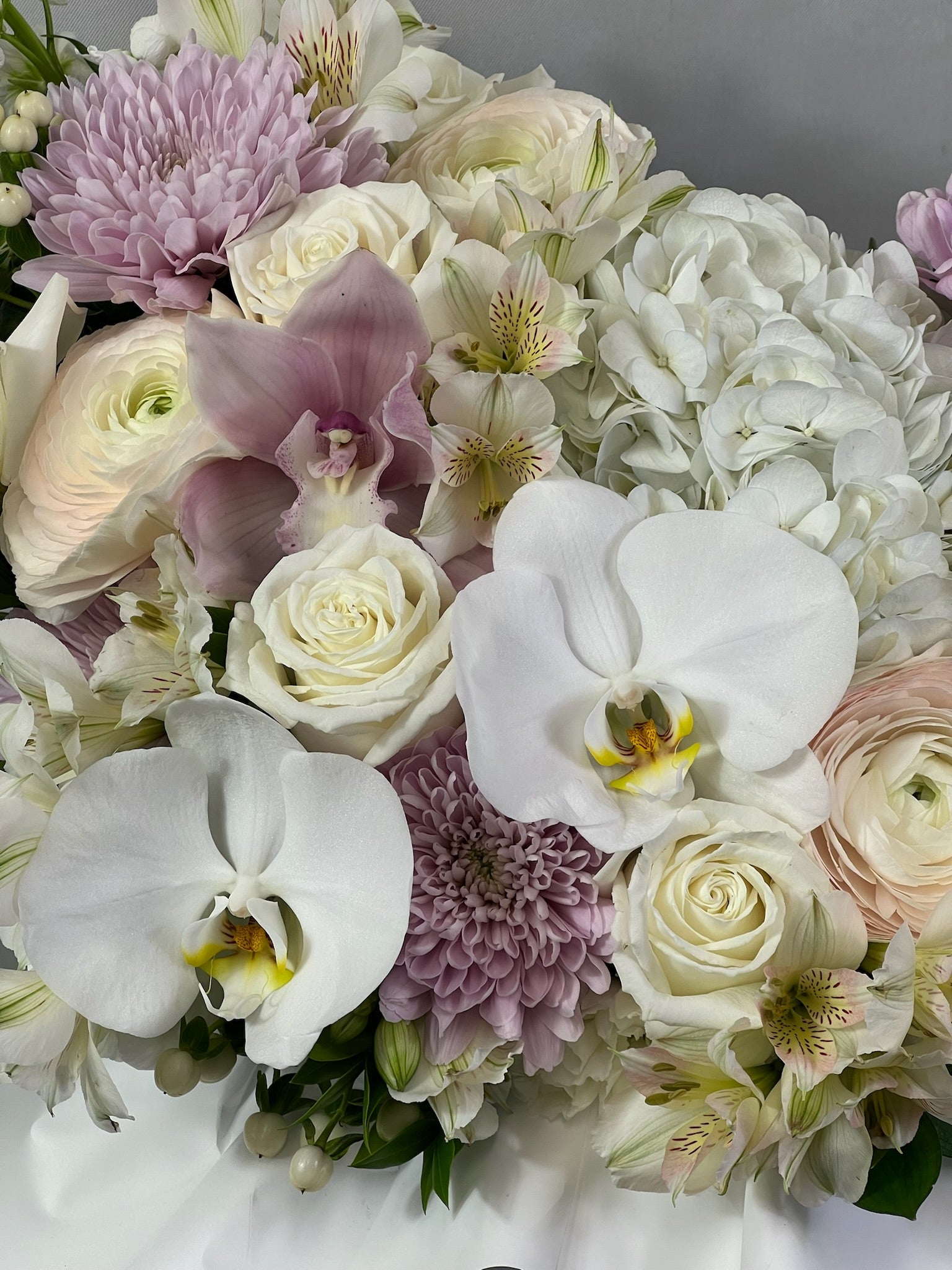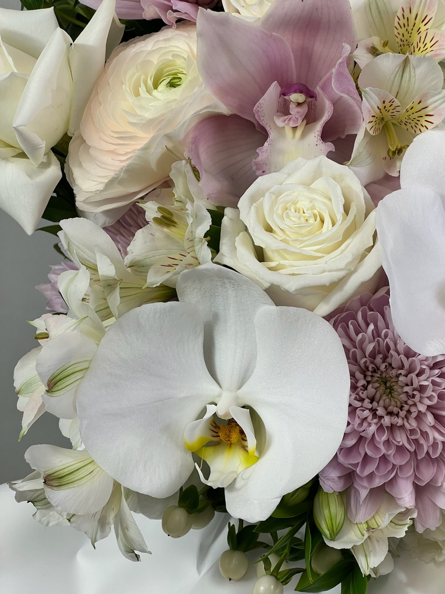 Introducing the "Mon Paris" floral arrangement, a luxurious blend of elegance and romance crafted in a stunning white and lavender palette. This breathtaking design features delicate phalaenopsis orchids, elegant cymbidium blooms, premium white roses, ranunculuses, and anemones, all carefully curated to create an unforgettable display of beauty. Perfect for any occasion, this arrangement exudes sophistication and grace.