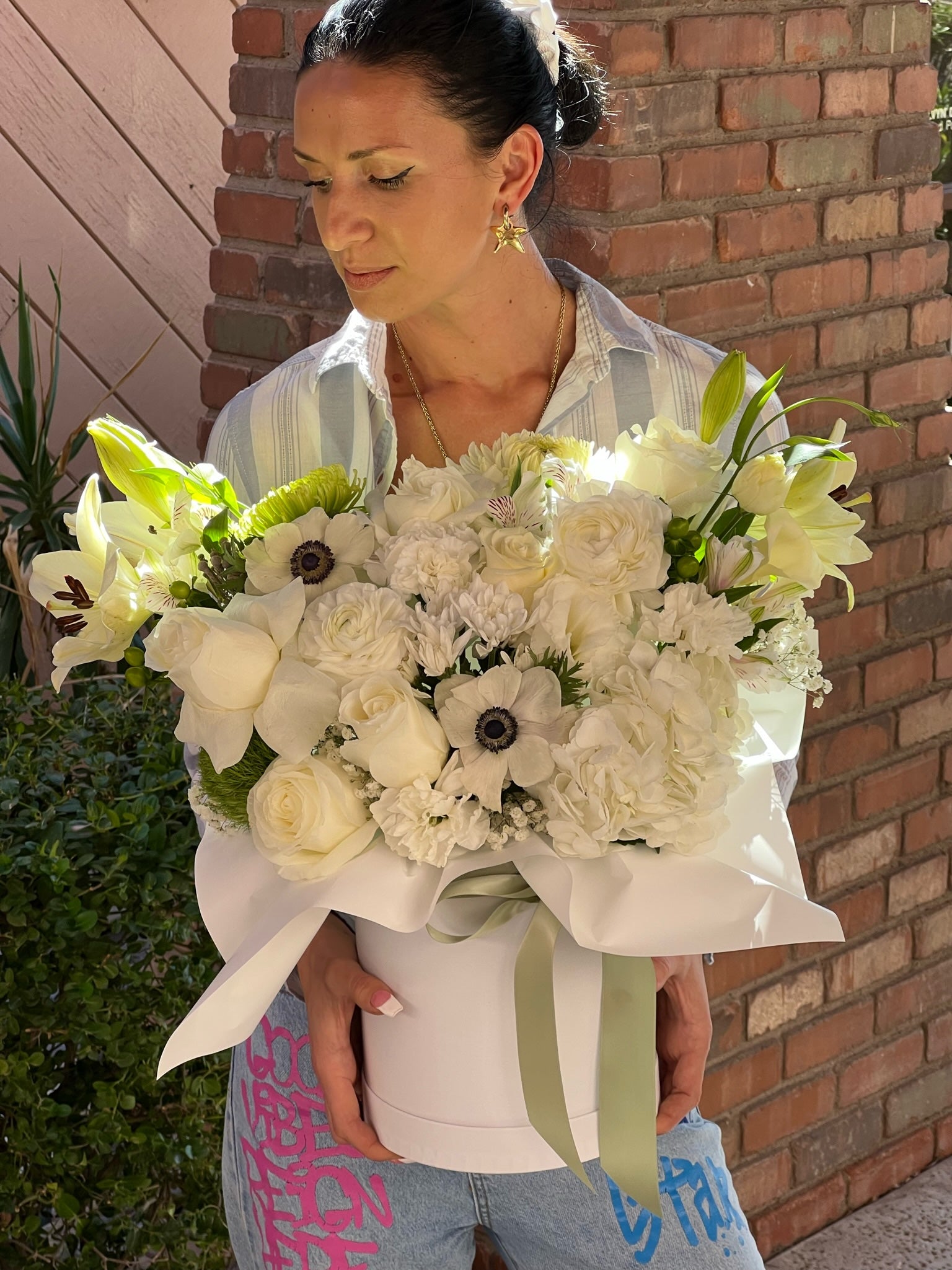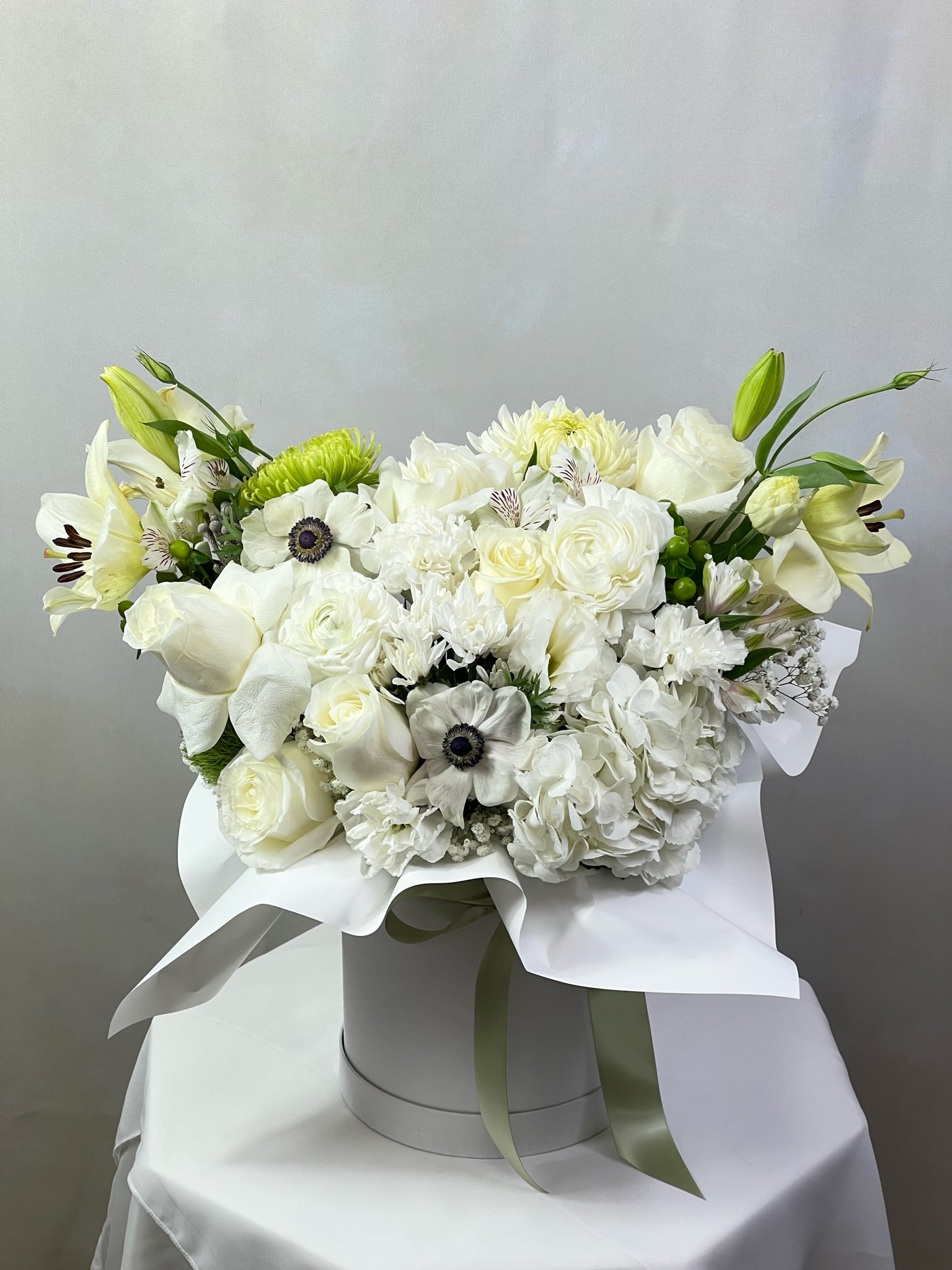 Behold the radiant beauty of our 'Morning Star' white floral arrangement, where purity and elegance converge in a harmonious bloom. This exquisite composition showcases the timeless grace of anemones, the classic allure of roses, the serene charm of lilies, and the delicate enchantment of hydrangea.