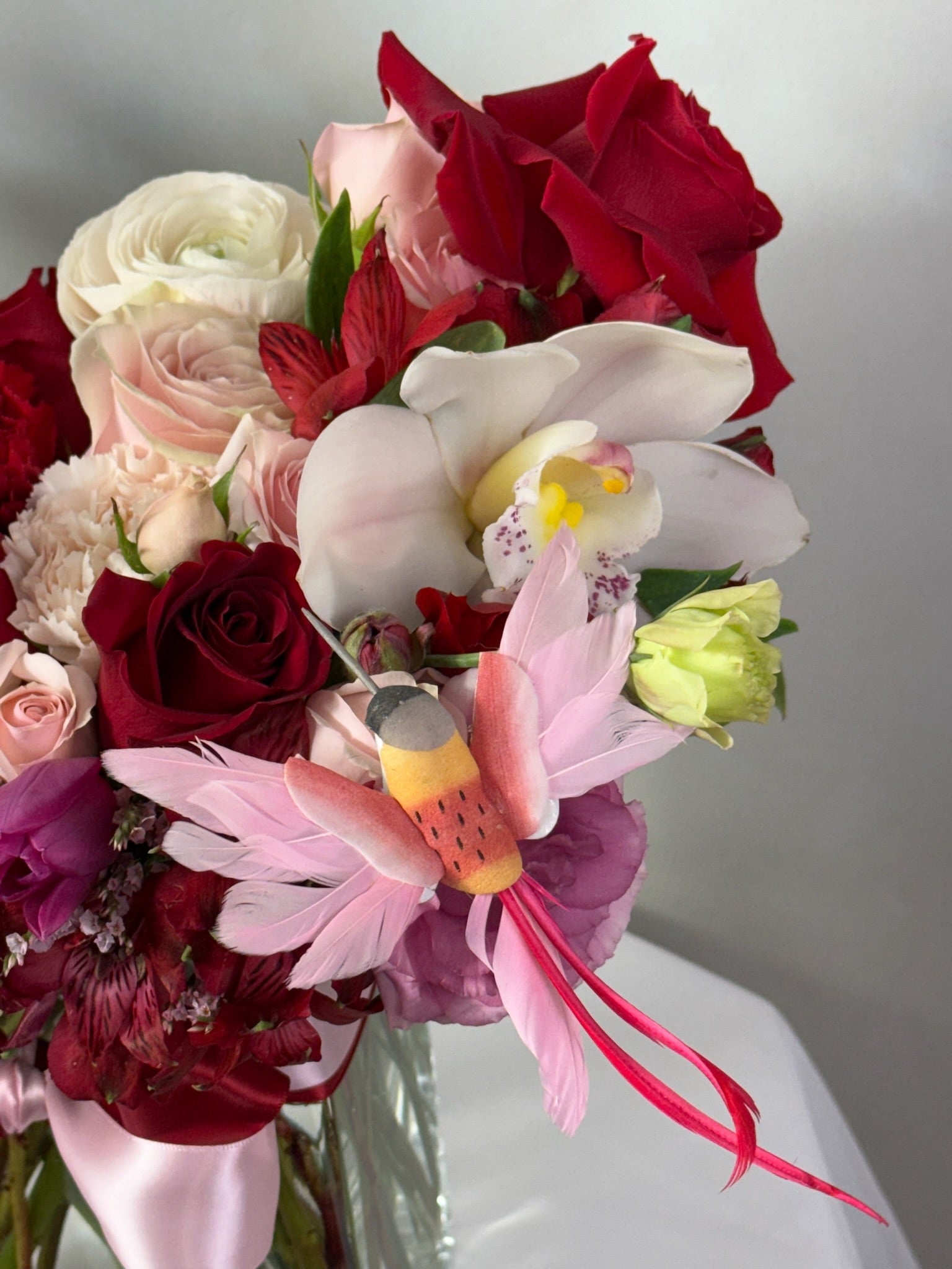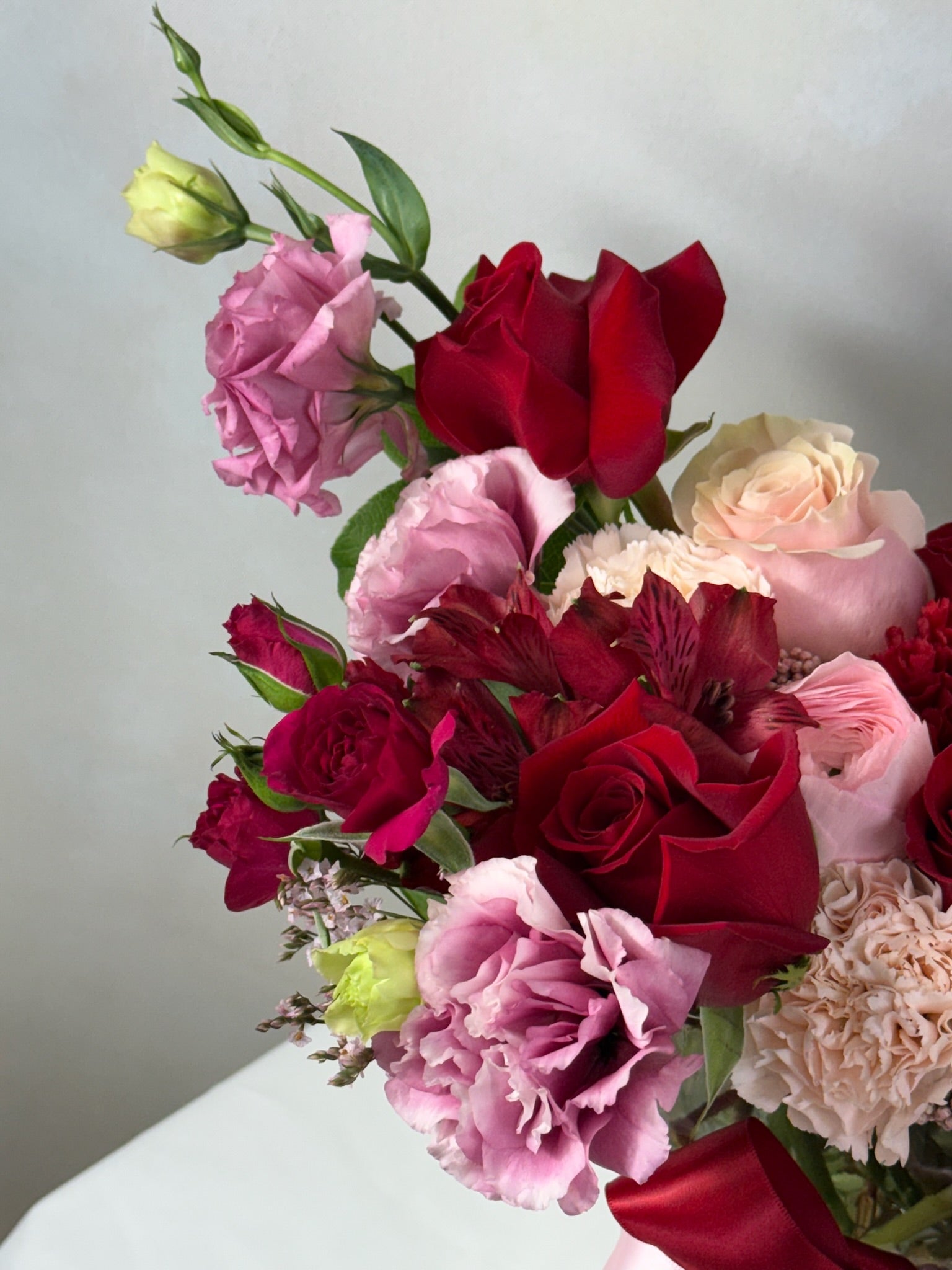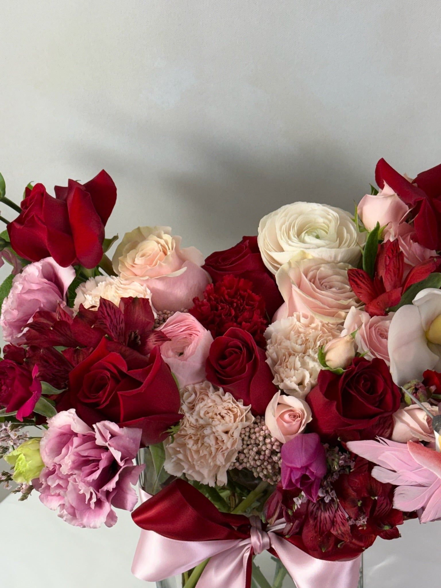 Rosabelle is a graceful blend of romance and elegance, designed to leave a lasting impression. This stunning arrangement features a rich medley of deep red roses, soft blush blooms, delicate pink florals, and graceful orchids, all tied together with flowing satin ribbons.