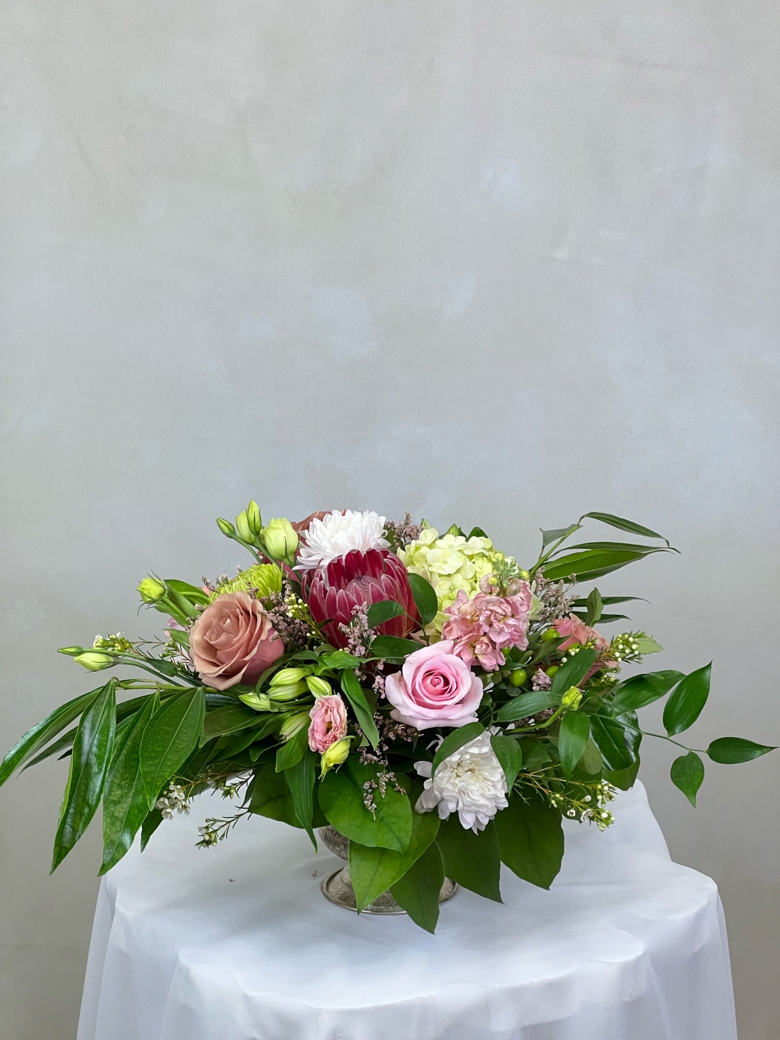 This stunning flower centerpiece is a captivating masterpiece that evokes a sense of natural beauty and grace. The lush and verdant greenery of cocculus, ruscus Israel, Italian salal, and waxflowers provide a rich and organic backdrop for the delicate and velvety blooms. The striking protea, with its bold and architectural structure, creates a strong focal point that draws the eye in, while the soft and romantic lisianthus and roses add a gentle and charming touch.