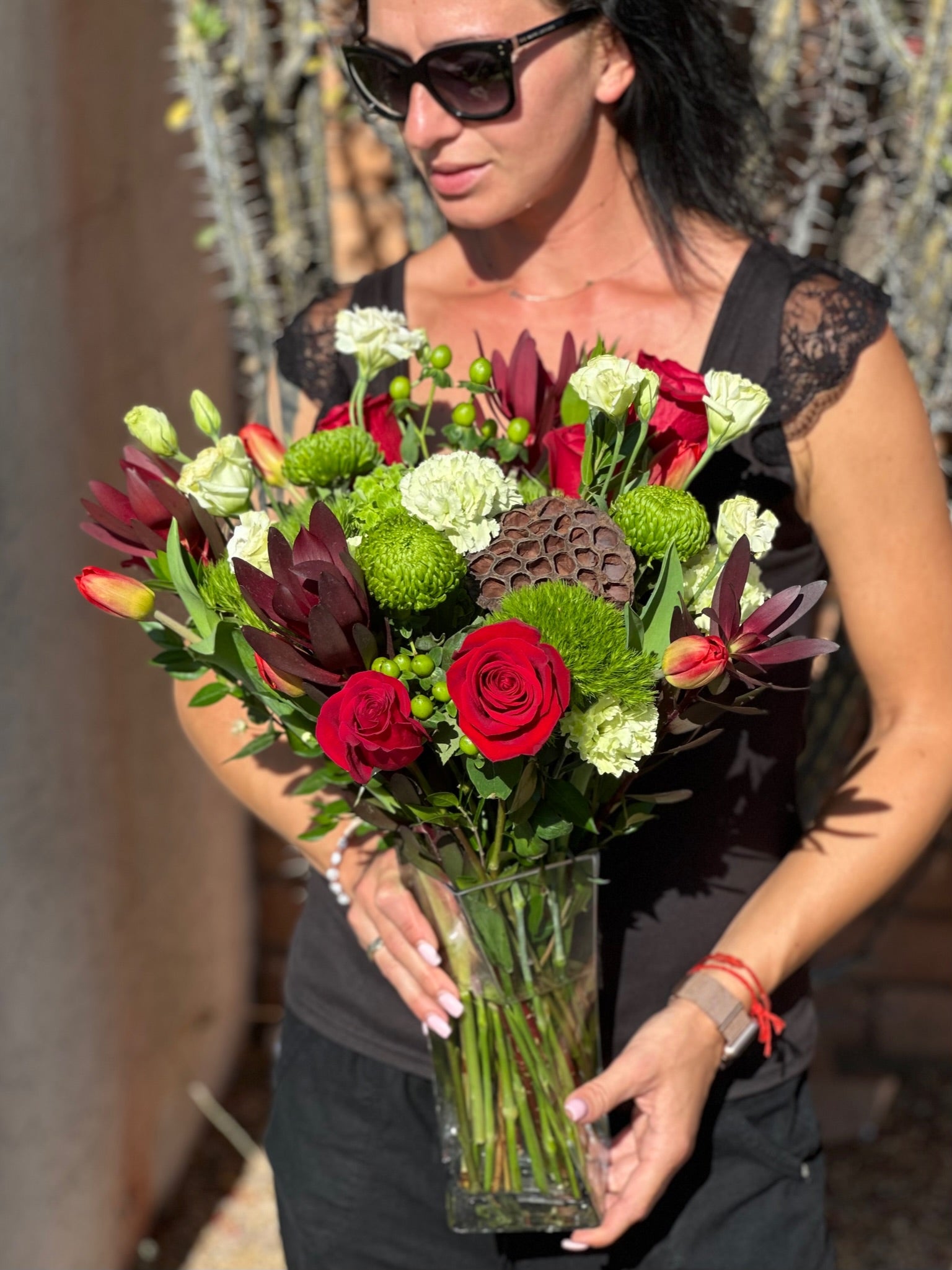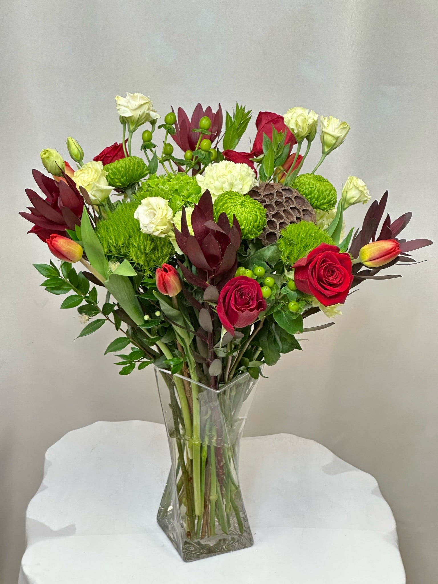 Introducing our elegant vase flower arrangement, an enchanting fusion of nature's finest blooms thoughtfully crafted for flower delivery in Scottsdale, AZ. Graceful tulips and charming dianthus dance alongside mums, creating a medley of colors that radiate warmth and beauty. Lavish hydrangea and vibrant hypericum berries add a touch of luxury, while lisianthus and safari lilies infuse an air of sophistication. Sprigs of myrtle provide a lush green embrace, allowing the star blooms of roses and carnations to bask in their timeless elegance. As you order flowers delivered in Scottsdale, AZ, rest assured that this arrangement will arrive fresh and exquisitely presented, ready to create an enduring impression. Whether you seek to celebrate a cherished moment, express your deepest sentiments, or surprise someone with a token of love, flower arrangement from our florist in Scottsdale is the perfect choice. Let the allure of these exquisite blooms weave their magic and grace your space with everlasting beauty.