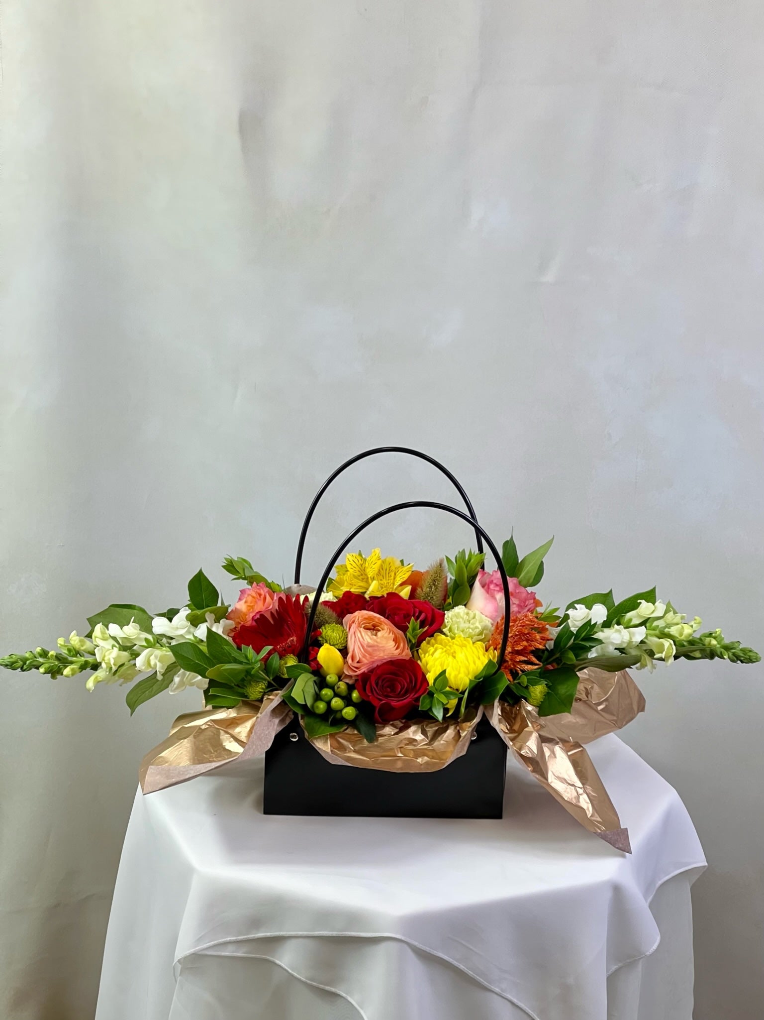Introducing our 'Venetian Bag' floral arrangement, where timeless elegance meets modern chic. This exquisite creation marries the charm of Venetian allure with the artistic touch of a carefully curated floral ensemble. Nestled within an ornate bag reminiscent of Venetian opulence, you'll discover a symphony of blooms that mirror the timeless beauty of Venice's canals and architecture. Each bloom is carefully chosen to harmonize with the other, creating a masterpiece that's more than just a floral arrangement; it's a work of art, a conversation piece, and a piece of Venice's charm, brought to life in petals and stems. The 'Venetian Bag' arrangement is the perfect choice for elevating any occasion, from celebrations to expressions of love and appreciation, and it's ready for prompt flower delivery, ensuring that Venetian splendor arrives at your doorstep.