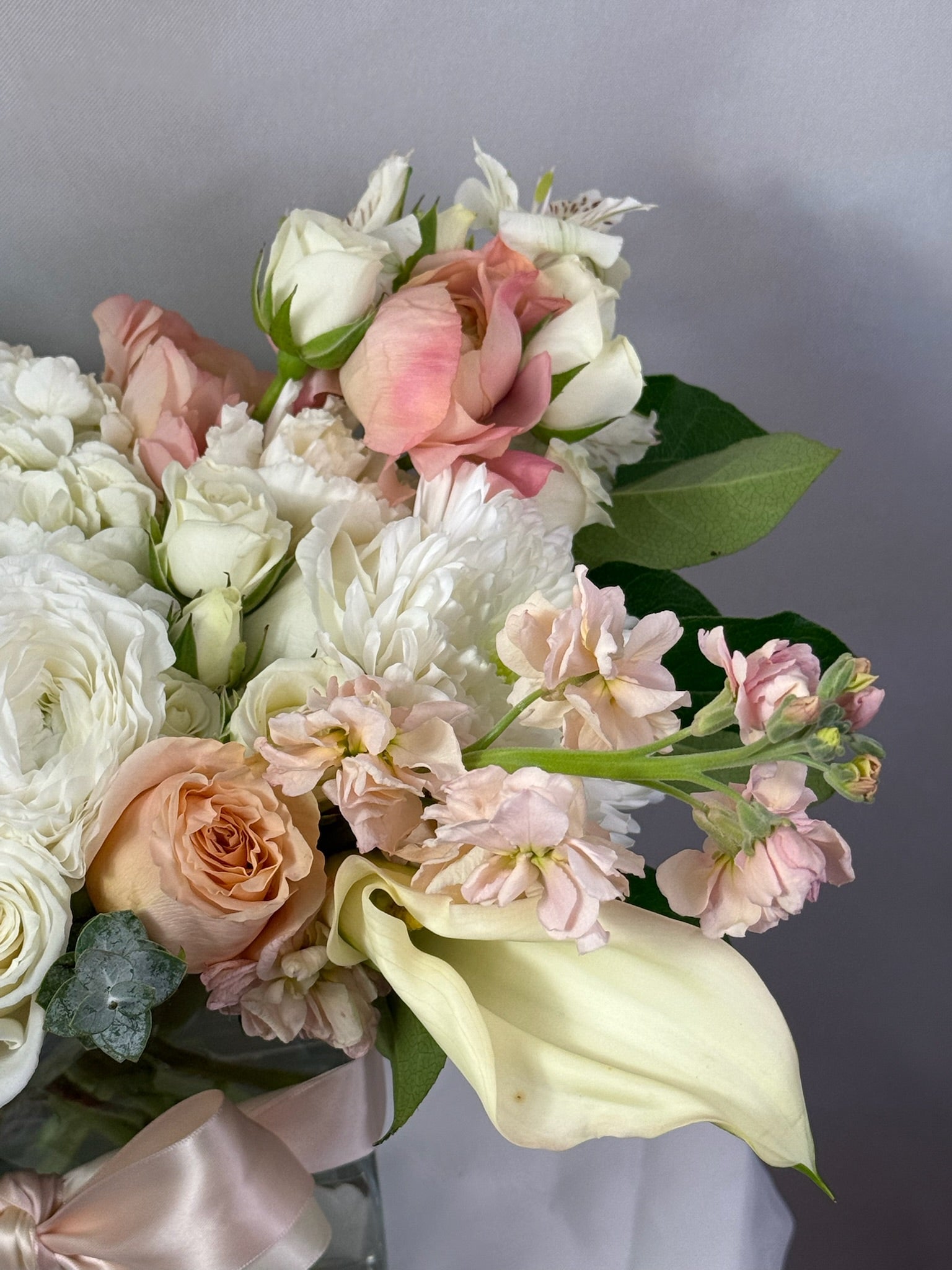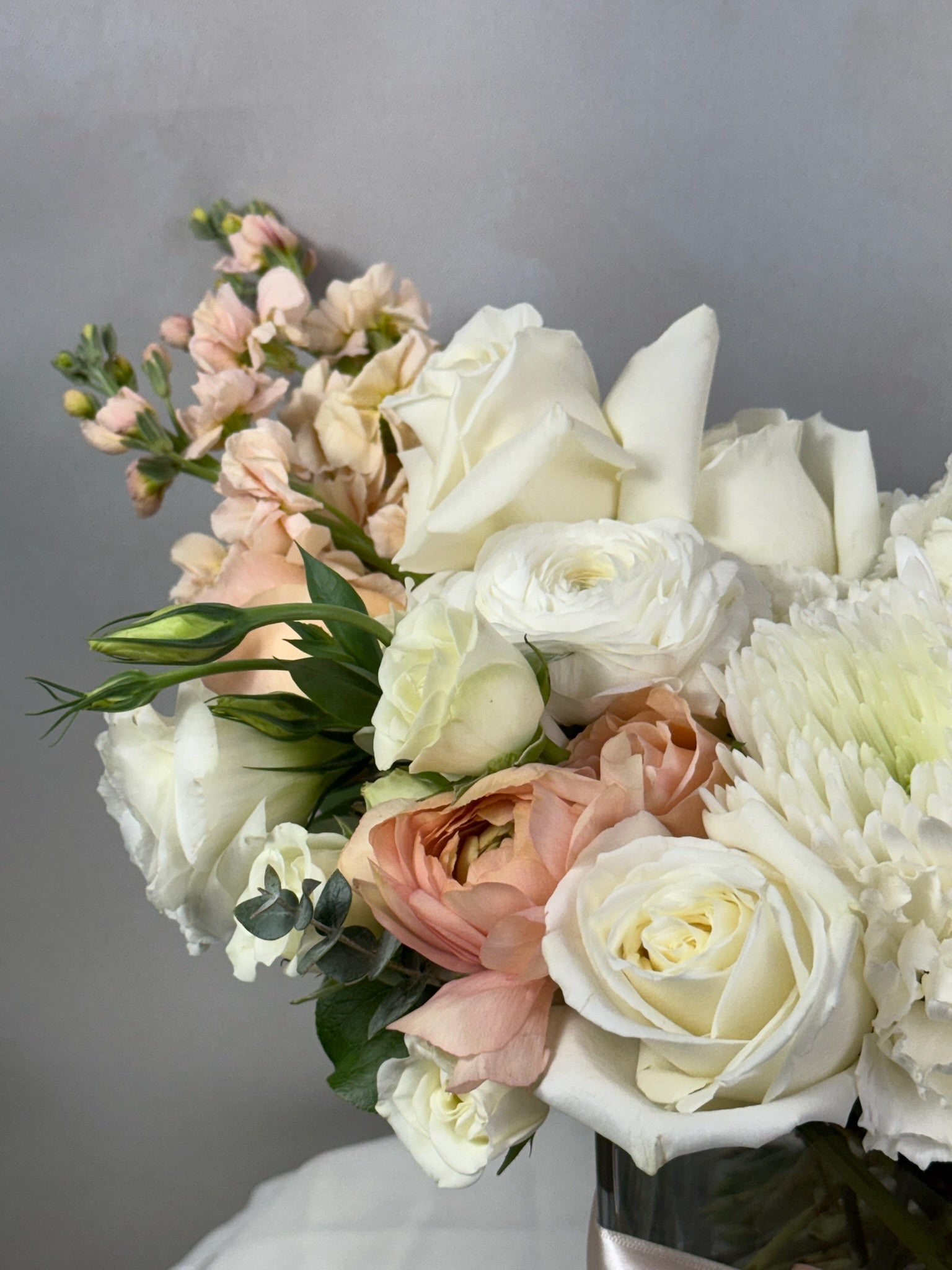 The Vivienne arrangement embodies pure elegance with its harmonious blend of cream and white blooms, perfect for any occasion. Soft, velvety petals in shades of ivory and warm cream create a serene palette, while subtle textures add depth and refinement. The delicate mix of airy, open blossoms and structured accents offers a graceful flow, bringing a sense of lightness and sophistication. Available for flower delivery in Scottsdale, Vivienne is arranged in a sleek, understated vase, ideal for those seeking a classic, luminous piece that exudes effortless charm and beauty.