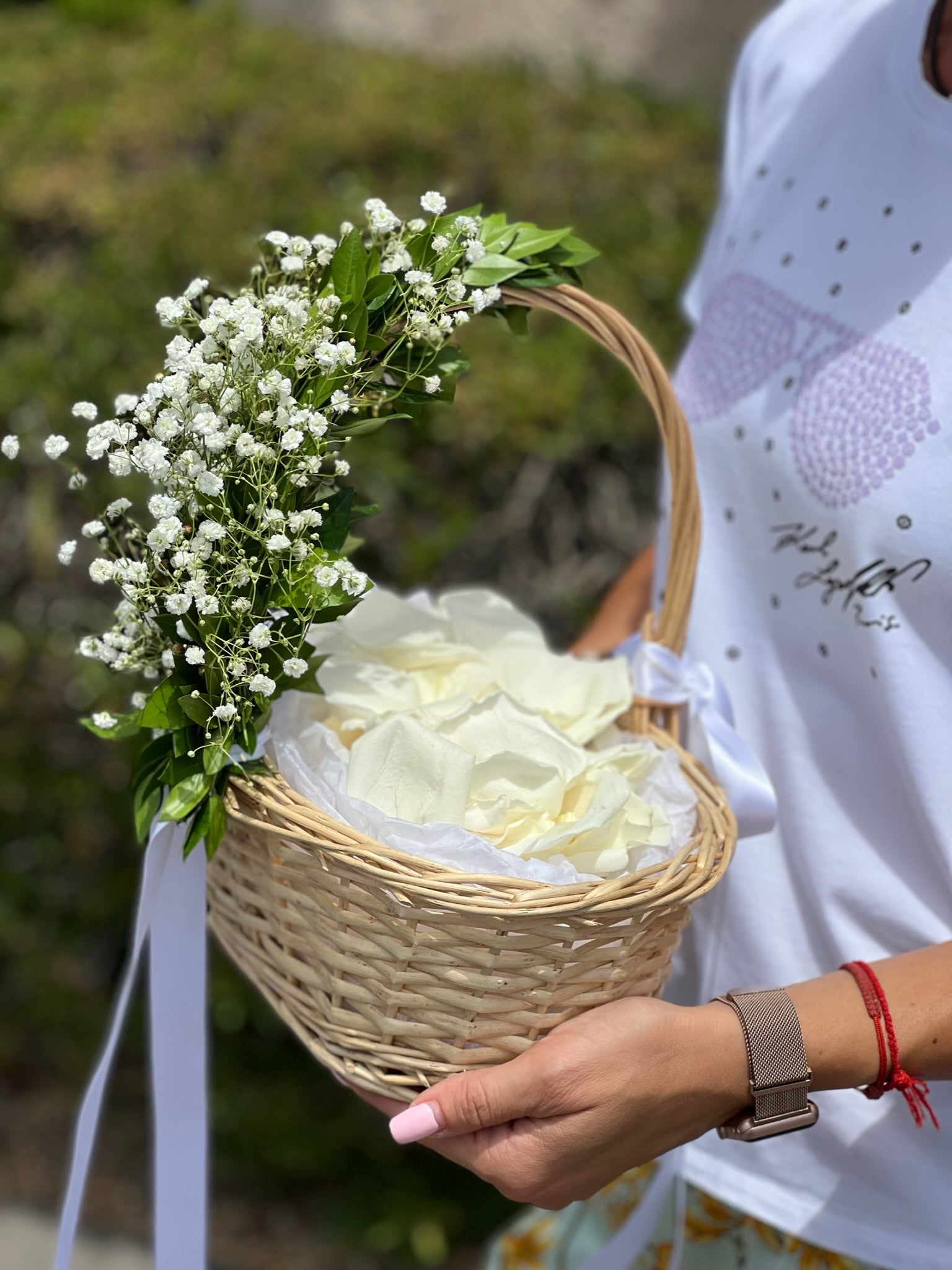 Experience the sheer beauty and delicate allure of the one-of-a-kind wedding basket designed to enchant and delight by our wedding florists. Overflowing with an abundant array of fragrant petals, this exquisite creation transforms any wedding ceremony into a magical realm of petals and dreams. This is more than a basket; it is a symbol of new beginnings and the fragility of love. With a graceful toss, it adds a touch of enchantment to your ceremony, showering blessings upon your union and marking the start of a lifelong journey filled with beauty and joy.